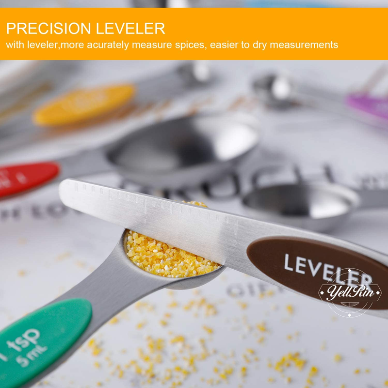 ?Magnetic Measuring Spoons Set?- measuring spoons set of 8 with spirit level help you measure spices accurately. The double-ended design of the measuring spoon, like a set of two, can fit any bottle mouth. Different sizes: 1/8 tsp, 1/4 tsp, 1/2 tsp, 3/4 tsp, 1 tsp, 1/2 Tbsp, 1 Tbsp plus Leveler. labels allow you to quickly find them while cooking, accurate and easy to read tsp/tbsp and ml, clear measurement markings are durable to help prevent fading or washing off.