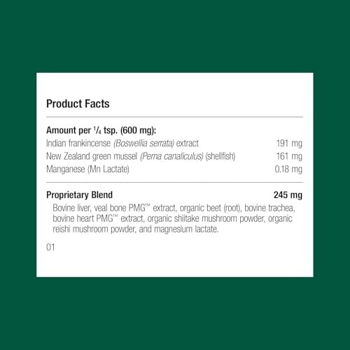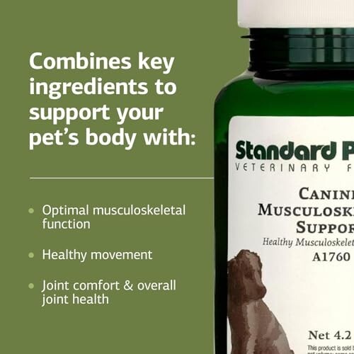 Musculoskeletal Support Pet Supplement: This supplement contains ingredients like Boswellia serrata and New Zealand green mussel for dog joint support and comfort Joint Bone Health Support: This dog supplement for muscle health also supports joint and bone health; aid canine muscle health Nutrient-Rich Ligament Supplement: This supplement for dogs features a proprietary mix that includes bovine liver and organic mushrooms to support your pet's musculoskeletal health Supplement Measurement Dosing: Includes a 1/8 teaspoon scoop for small bottles and a 1/2 teaspoon scoop for large bottles for an accurate dosage based on your dog's weight About Standard Process: Standard Process has been an industry leader in whole food based nutritional supplements for over 95 years