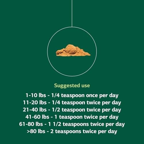 This canine supplement has a dose schedule that's based on body weight. This supplement includes a 1/8 teaspoon scoop with small powder bottles and a 1/2 teaspoon scoop with large ones.