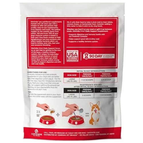 Your dog?s health starts in the gut?and so does Dinovite. This 3-in-1 daily supplement delivers powerful digestive, immune, and skin coat support with every scoop. We combine prebiotics, probiotics, omega-3 6 fatty acids, zinc, and vitamin E to help restore balance from the inside out. Whether you're battling itchy skin, hair loss, paw licking, or digestive upset, Dinovite targets the root causes, not just the symptoms. Just one scoop a day is all it takes to promote vibrant energy, strong immunity, and a soft, shiny coat. Trusted by pet parents for over 20 years.