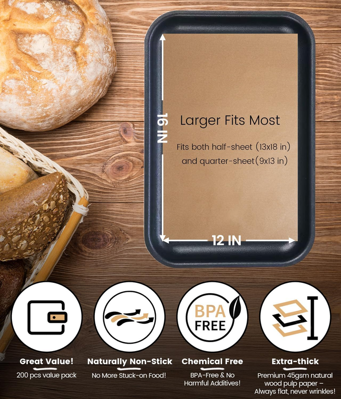 200 PCS Unbleached Parchment Paper Sheets for Baking 12X16 Inches, Non-Stick and Non-Toxic Pre-Cut Parchment Sheets for Oven, Cooking, Grilling, Air Fryer and Steaming - Fit for Half Sheet Pans