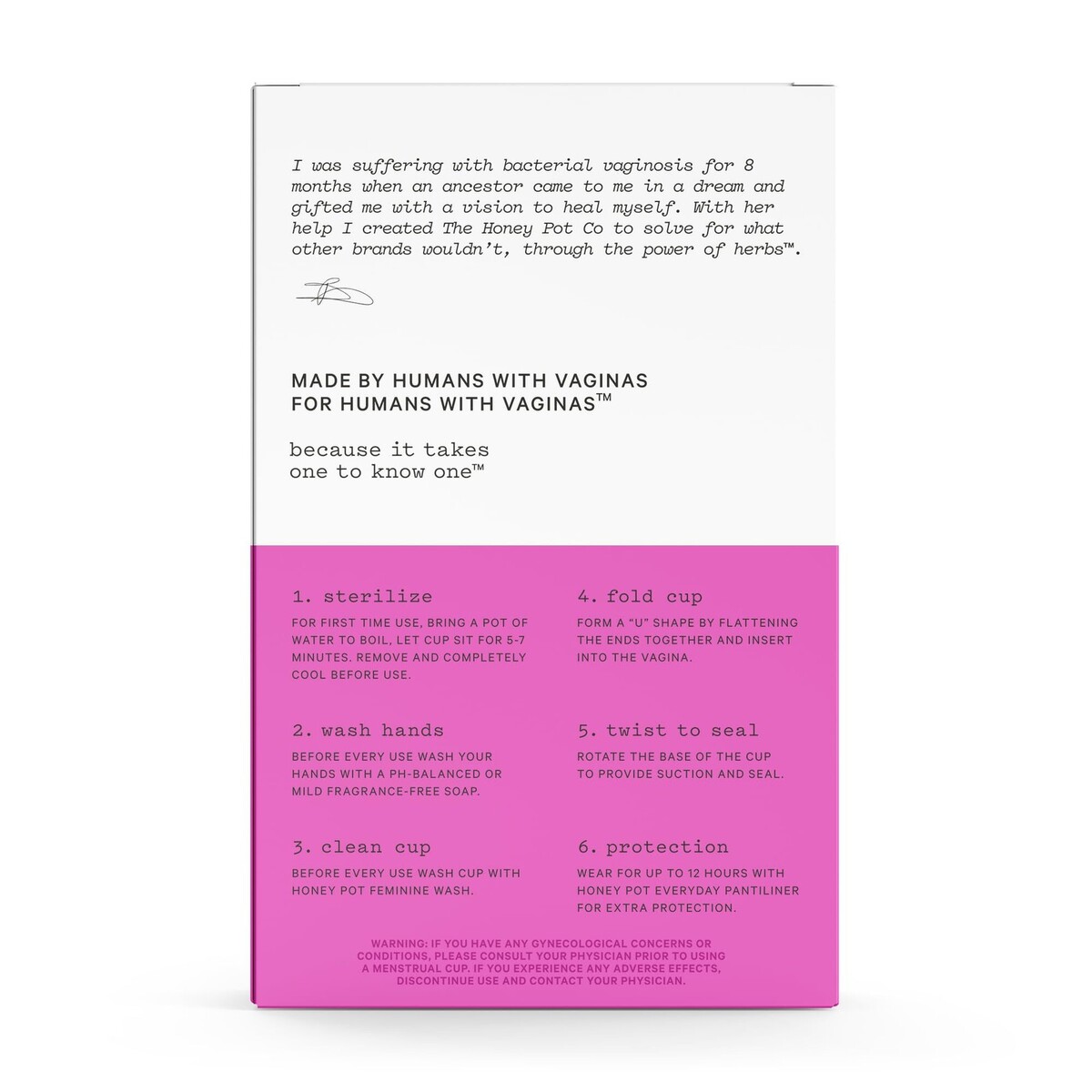 ? If tampons or pads aren't your cup of tea, reach for the Honey Pot Co Menstrual Cup: a convenient, sustainable alternative that's good for you and the earth ? The feminine menstrual cup is made with medical grade silicone and is free from latex and phthalates ? Our silicone menstrual cup can be reused over and over again ? Our feminine cup comes in two sizes: Size 1 is ideal for those with a light to medium flow while Size 2 is ideal for those with a medium to heavy flow ? A message from our founder Bea Dixon: I was suffering with BV when an ancestor came to me in a dream and gifted me with a vision to heal myself; with her help I created The Honey Pot, feminine care powered by herbs that is backed by science, clinically and gynecologist tested; Made by humans with vaginas, for humans with vaginas, because it takes one to know one