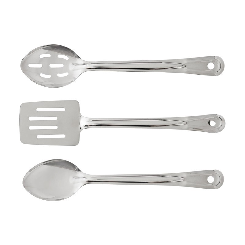 Ten-piece cookware set is perfect for preparing everything you need for amazing meals Suitable for induction cooktops. Materials: Stainless steel, glass Ideal for everyday family meals or for entertaining guests on special occasions Essential, practical cookware set for any kitchen Crafted with ultra-durable, sleek stainless steel and transparent glass for great performance and style Pots and pans feature riveted handles, heat- and shatter-resistant glass lids, and tri-ply bases for even heat distribution and quick cooking Care: Dishwasher safe. Before ?rst use, cookware should be washed in hot soapy water using a soft sponge or dishcloth, then immediately rinsed and dried thoroughly. Do not boil dry or put empty pan on hot cooking surface. Do not use cookware on high heat or high ?ames; use medium or lower heat settings. Match base of pan to stove burner size. High heat, high flame, or boiling dry may cause cookware to discolor and warp. Handles and knobs may warm during heating. It is recommended to use oven mitts or pot holders when handling. To prevent warping during cleaning, allow cookware to cool before washing. Includes one 8.5? saute pan, one 1-qt saucepan, one 2-qt saucepan, one 4-qt Dutch oven, 3 vented glass lids, 1 solid serving spoon, 1 slotted serving spoon, and 1 slotted spatula