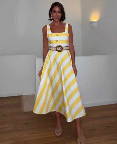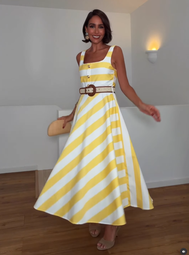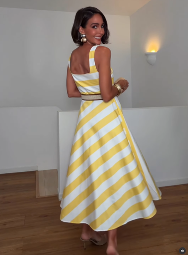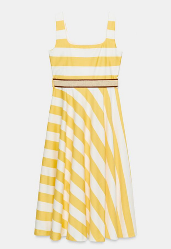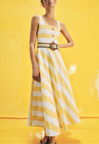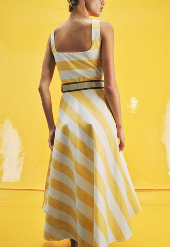 Striped midi dress in white yellow with a straight neck.
