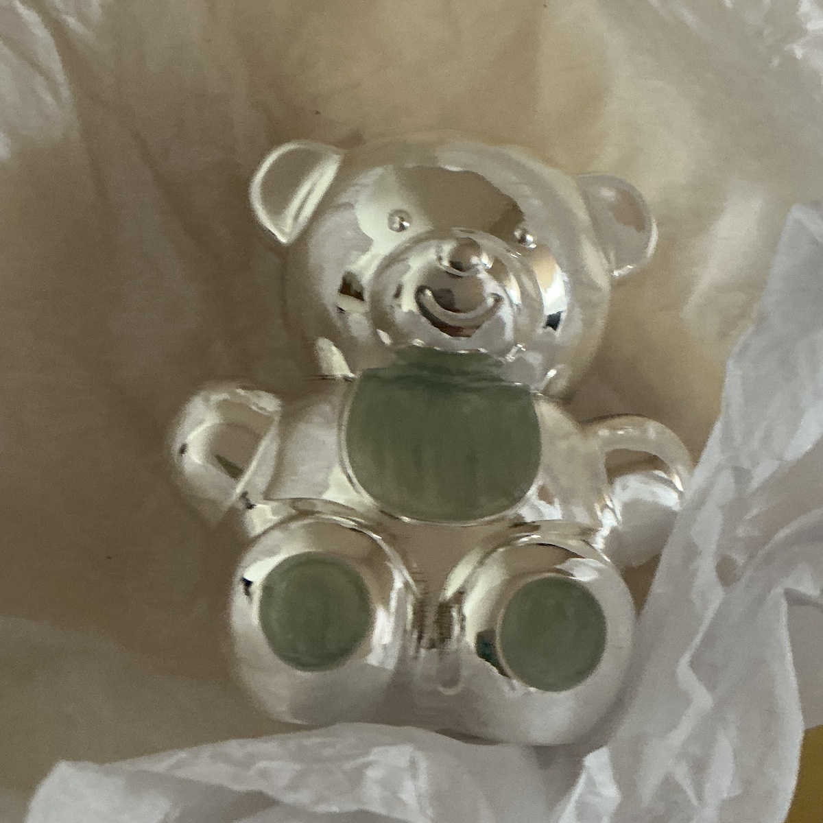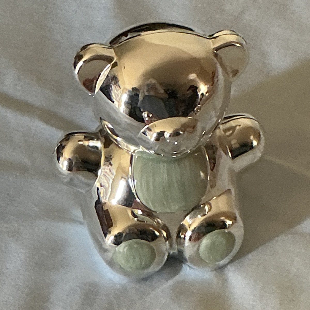 The back is all metal platinum color the front for the teddy bear bank is platinum with face stamped and winter blue mint colors spots