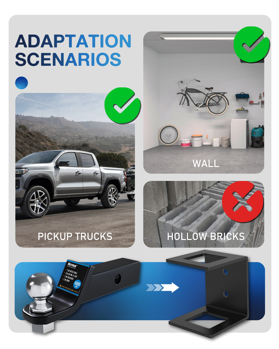 WIDELY USED: Mount securely in your pickup bed, garage wall, work van/truck, enclosed trailer, RV storage, workbench, or any desired location. This hitch holder makes storing the trailer hitches effortless