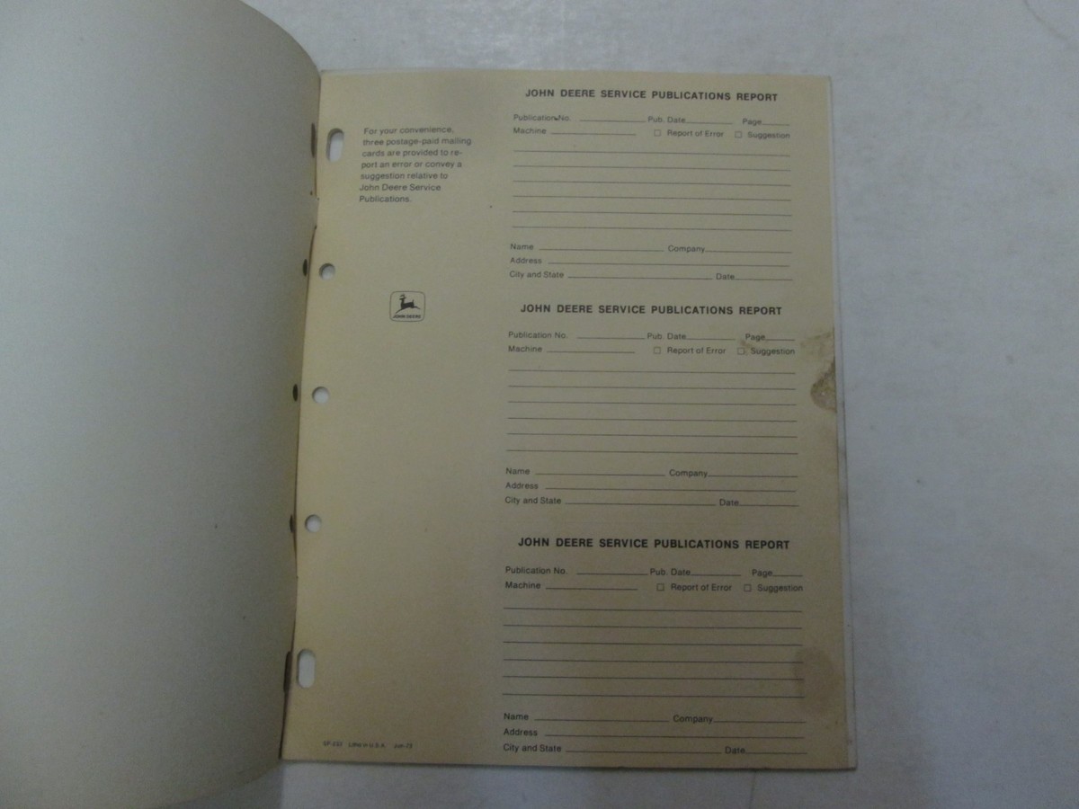 Loads of information and illustrations, step by step Instructions, exploded illustrations and/or diagrams, great manual to have when you own A JOHN DEERE. This manual will save you money in Repairs/Service. We will leave POSITIVE Feedback after we receive your payment. Please do not forget to give us POSITIVE Feedback and FIVE Stars on all of the Detailed Seller Ratings! If you are not satisfied with your shopping Experience, please contact us to get a solution before you decide to leave a NEUTRAL or a NEGATIVE Feedback, We will do our best to solve any problems for you as soon as possible. We will provide you with the BEST POSSIBLE service because the POSITIVEFeedback and FIVE Stars are what we are striving for. Please email me through "My Messages" or "Ask Seller Questions" if you have a