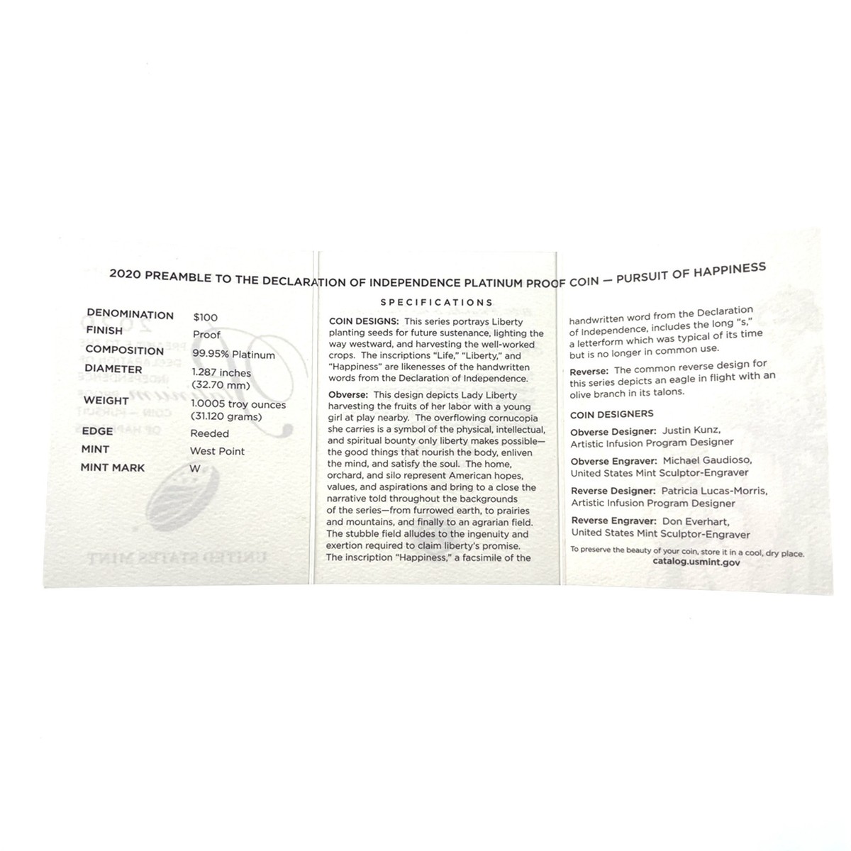 2020-W 1 Oz. Platinum American Eagle Proof Coin Preamble to The Declaration
