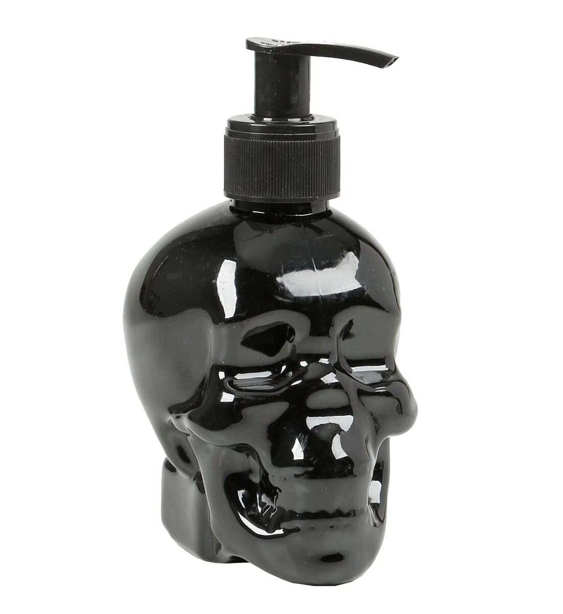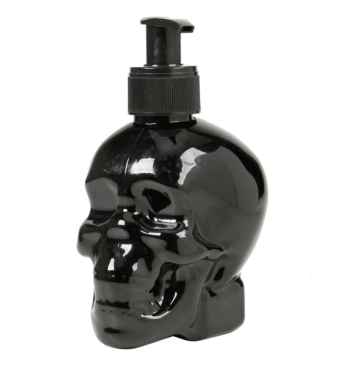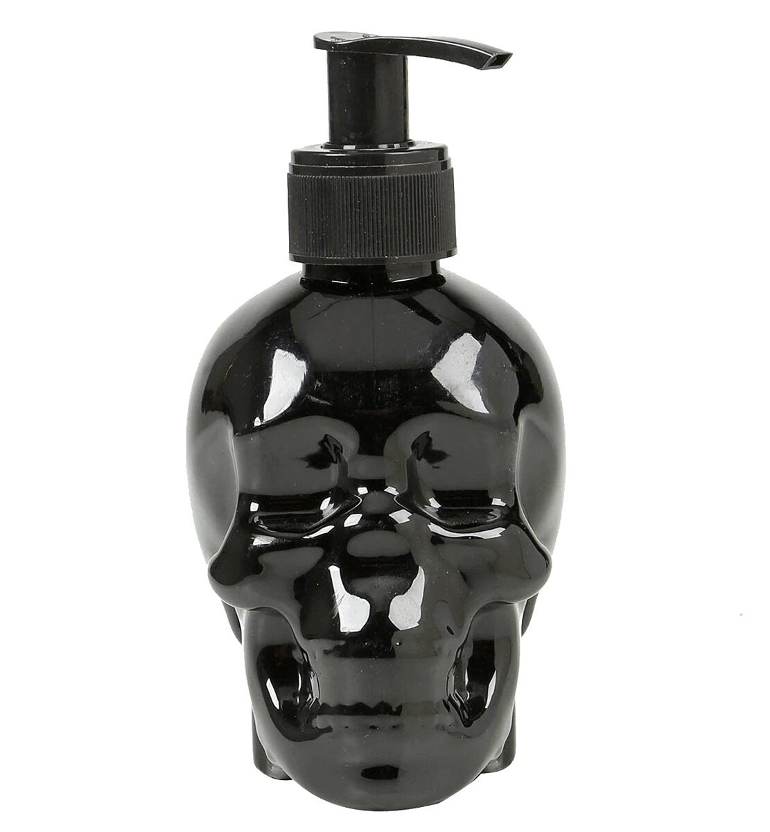 Product description: Refillable Spooky Gothic BLACK SKULL HEAD SHAPED SOAP DISPENSER Filled with Pomegranate-Vanilla Scented Liquid Cleansing Hand Soap Plastic Container with Pump for Bathroom or Kitchen - 8.6 fl oz.