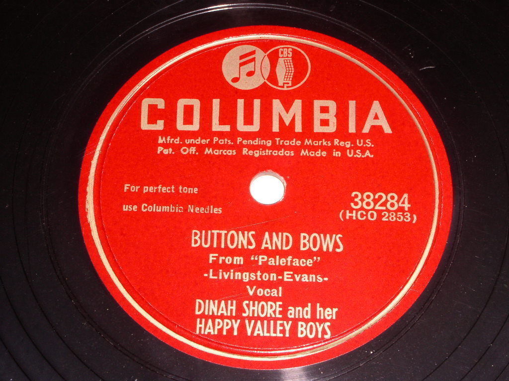 This is a 78 rpm phonograph record by Dinah Shore. Title: "Buttons And Bows"/"Daddy-O". Record label: Columbia 38284.