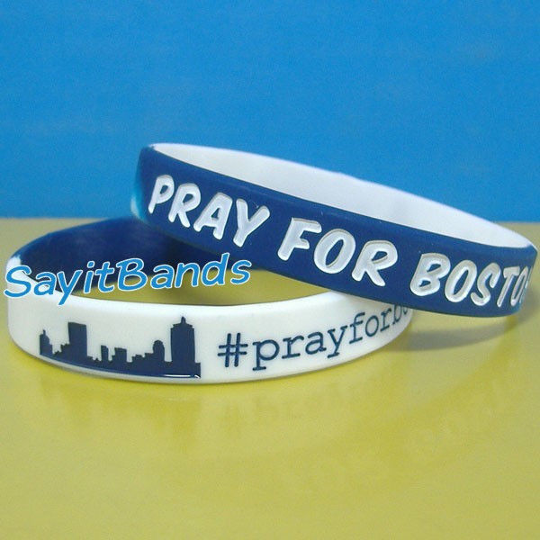 Our PRAY FOR BOSTON bands feature the text in bold letters. They are debossed and color filled. They also include a silhouette of the city of Boston.