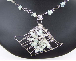 .925 argentium sterling silver wire wrapped necklace with aquamarine chips in a diamond shaped pendant. The necklace is made with aquamarine chips and sterling silver beads and can be worn with or without the pendant.