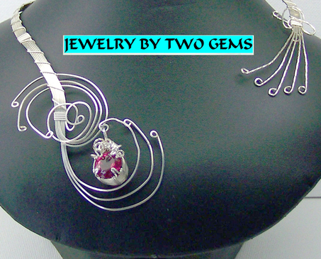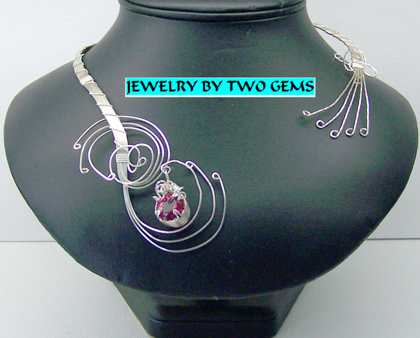 This is a sterling silver wire wrap torque necklace with a prong set wire wrapped lab created ruby as a center piece in the mist of swrls.The tourque style is made to nestle around your neck This is made from 925 argentium sterling silver in 21 gauge This measures 19 inchesThis elegant piece will be the bell of the ball The ruby is really on fire.