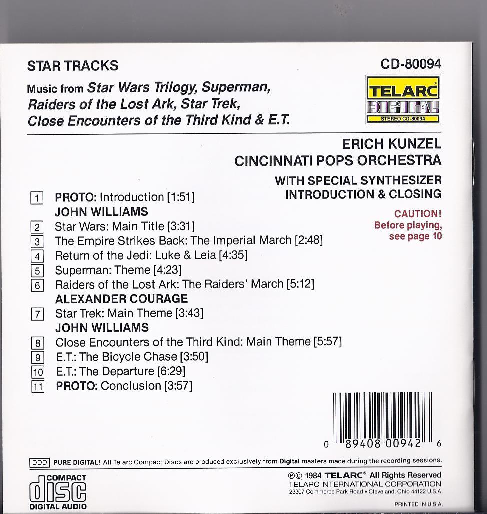 STAR TRACKS Audio CD by Erich Kunzel with the Cincinnati Pops Orchestra with special Synthesizer Introduction Closing - Lower levels are recommended for initial playback until a safe level can be determined for your equipment.