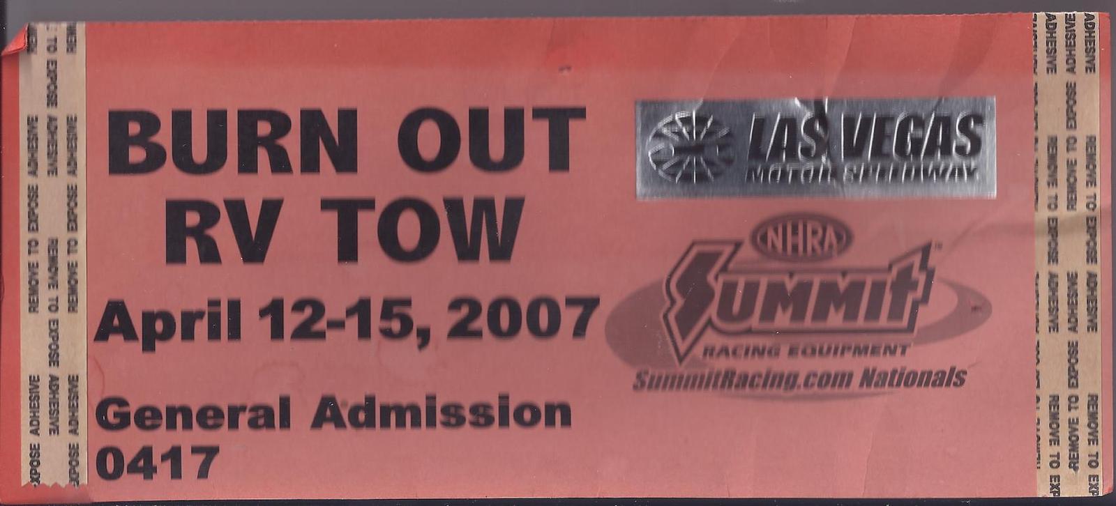 Vintage. Original. Car pass stub to the April 12-15,2007 "BURN OUT RV TOW" event at held at the Las Vegas Motor Speedway sponsored by the NHRA Summit Racing Equipment.