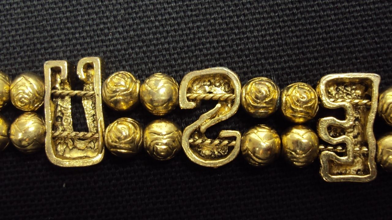 This beautiful bronze-toned metal charm bracelet by TOFA is approximately 7 1/2โ long and features charms that slide back forth along a double chain. Charms included are large block letters that spell out the name of Jesus, with groups of small metal beads/balls separating the letters. The bracelet is secured with a folding clasp closure that is mounted between a pair of TOFA's signature wheat crescent charms. This item ships free to all USA addresses!