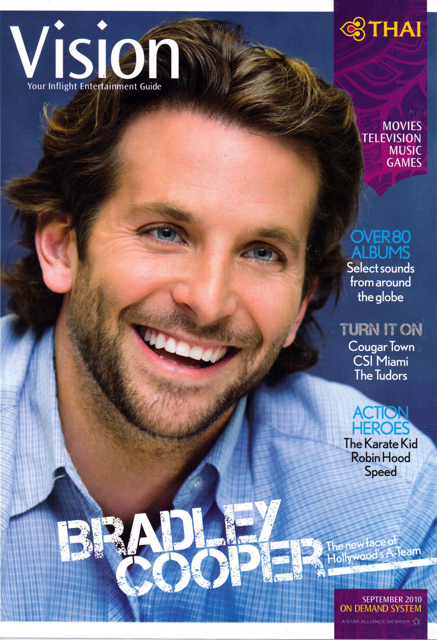 This is the Sept 2010 issue of THAI Airways' In flight Entertainment Guide with Spotlight on BRADLEY COOPER, an American film, theatre TV actor, best known for his roles as WILL TIPPIN in the TV series, ALIAS, PHIL WENNECK in the 2009 film, THE HANGOVER, TEMPLETON "FACEMENAN PECK in the 2010 movie, THE A TEAM.