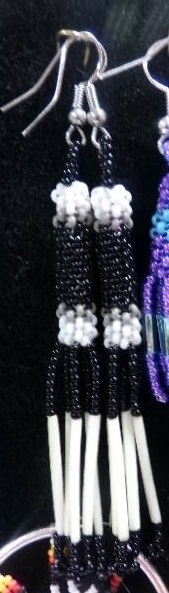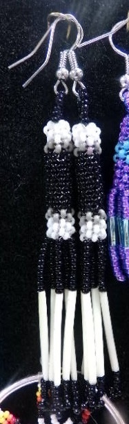 These earrings are made with cut glass beads and Porcupine Quills and are in colors of Black and White. These measures 3" long and they use a Silvertone hook to hang. I show several pairs of earrings in the other picture as an example of more earrings that we have available. This is for the #8 earrings only.