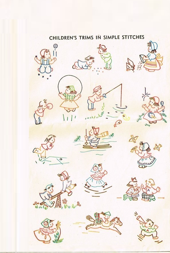 This is for a black and white copy taken from my vintage original #7404 transfer pattern .For embroidery.You will receive a copy of all 16 design motifs as well as stitch suggestions.Motifs feature: children at play for baby nursery clothing or decorating...Motifs average 3.75" x 3.75"(largest) to 1.5" x 2" (smallest) in size ........To use this copy you will need to either trace the design with a transfer pen and then iron onto fabric or trace it with a pencil directly onto fabric using a light source.(completed linens not for sale)****************This m aterial comes from a public domain source.{Printed in 1948 with copyright notice and entered public domain in 1976}This is a photocopy of my original pattern/linen which is in the public domain and does not infringe upon any copyrights RE:COPYRIGHTS My reproductions are adapted from original vintage transfers/patterns/linens in my personal collection.The ORIGINALS are now in the Public Domain because their copyright has expired....Because of alterations made by my editing these reproduction are entirely copyrighted by craftycharlie's and may not be recopied in any media.Purchases of these reproductions does not constitute permission to copy or reproduce. All images have been cleaned, restored / edited.. **************
