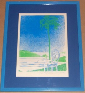 THIS MASTERPIECE IS MATTED AND ENCASED IN GLASS WITHIN A WOODEN BLUE COLORED FRAME DEPICTING A TROPICAL ATMOSPHERE OF SOUTH FLORIDA.