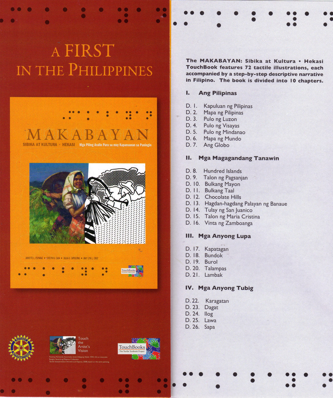 The MAKABAYAN Touch Books features 72 tactile illustrations, each accompanied by a step-by-step descriptive narrative in Filipino. The book is divided into ten chapters.