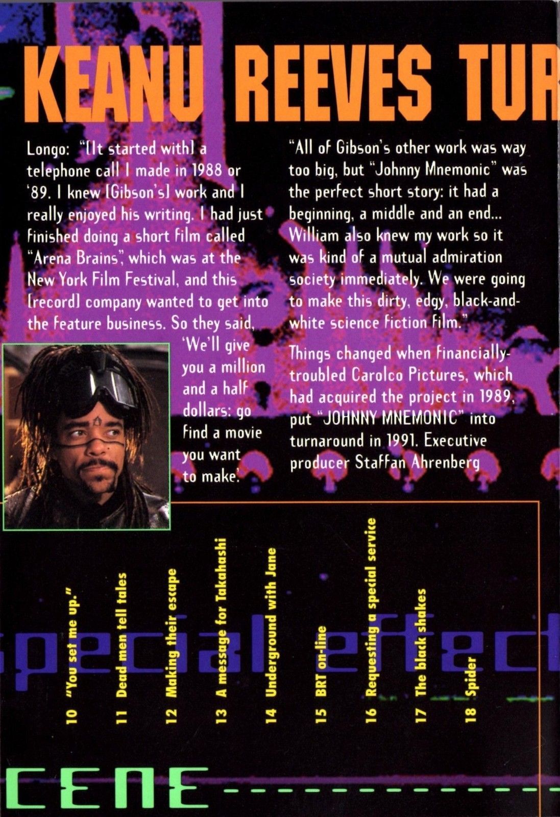 In 2021, the whole world is connected by the gigantic Internet, and almost a half of the population is suffering from the Nerve Attenuation Syndrome (NAS).Johnny with an inplanted memory chip in his brain was ordered to transport the over loaded information from Beijing to Newark. While Pharmakom Industries supported by yakuza tries to capture him to get the informaiton back, the Low-tech group led by J-Bone tries to break the missing code to download the cure of NAS which Johnny carries.