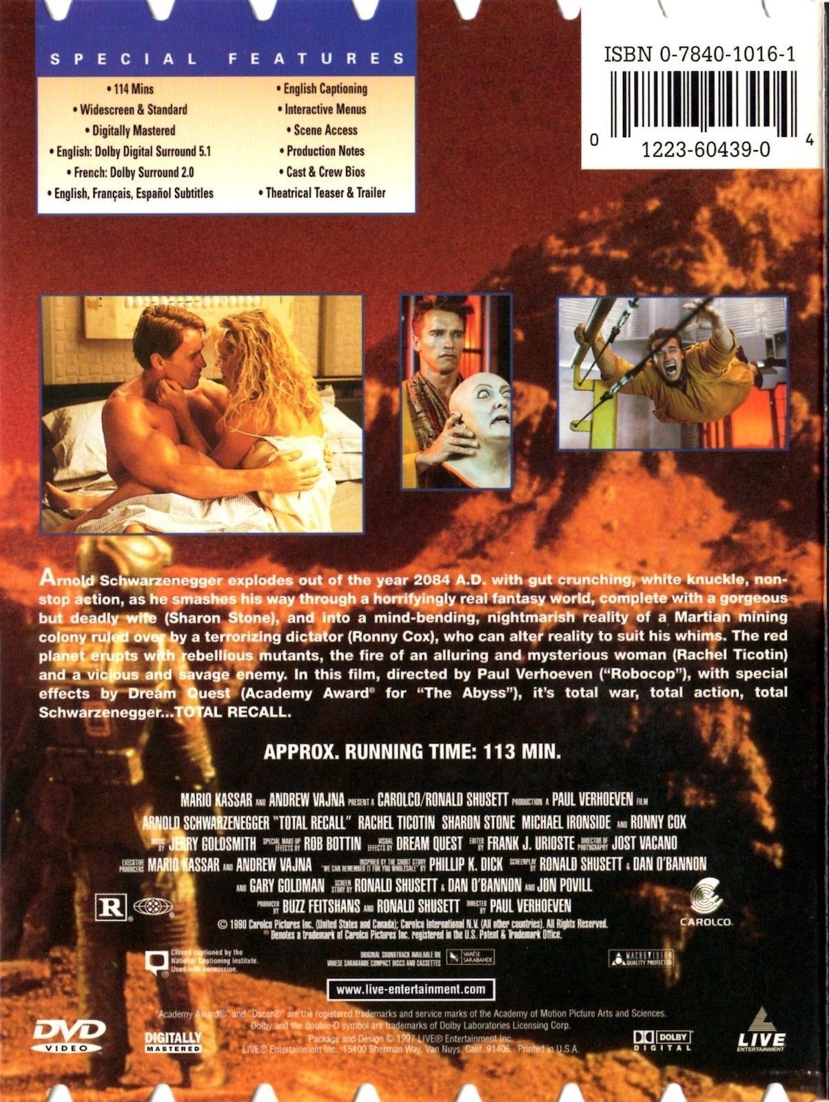 This is a previously viewed DVD of the rare science fiction classic TOTAL RECALL, staring: