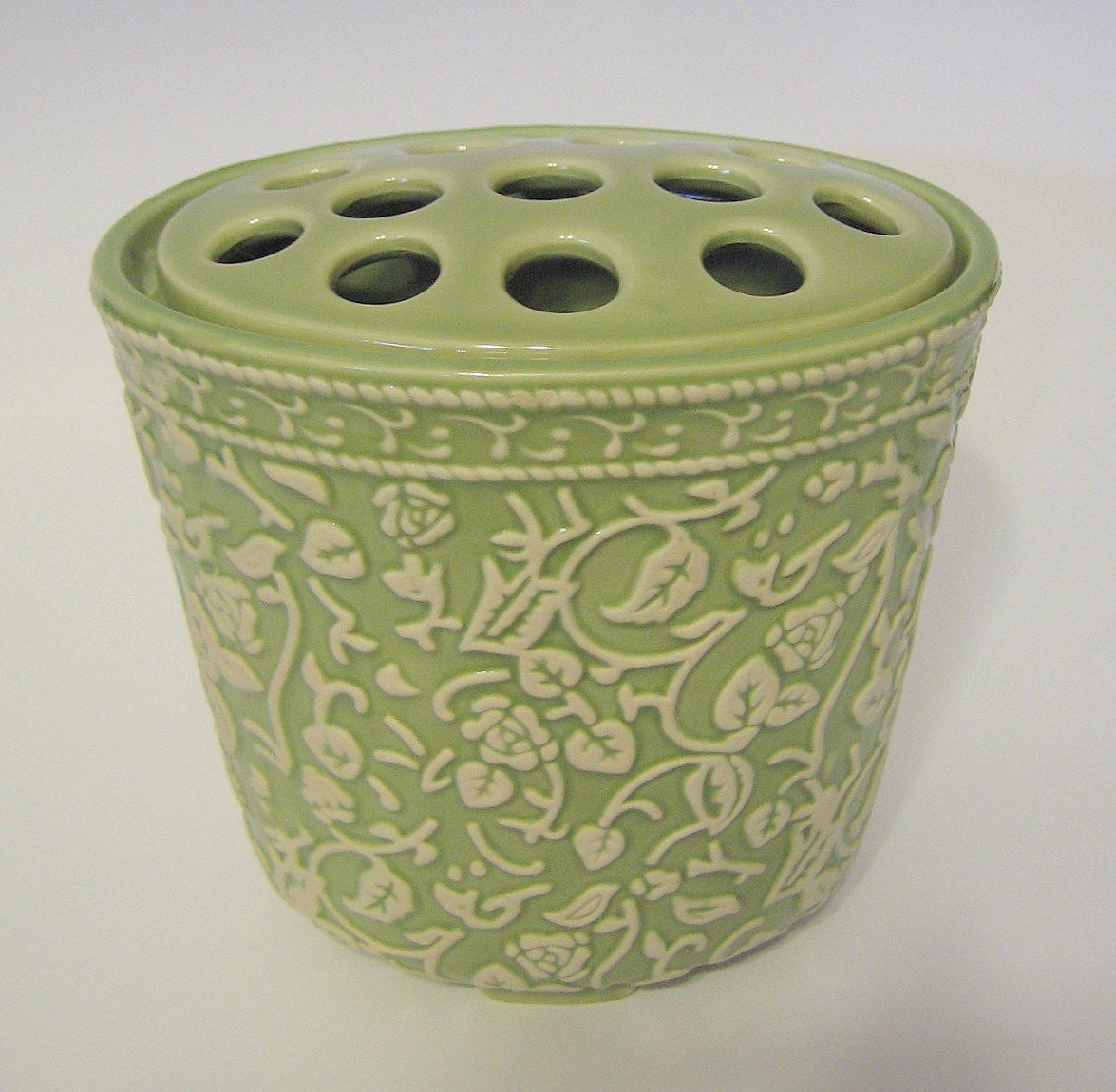 This is a delightful Better Homes Gardens Toothbrush Holder or Vase from the Better Home and Gardens Collection and manufactured by Home Interior. It has a feminine quality due to the floral design that covers the body of the holder. It is manufactured from ceramic material, glazed and kiln fired. The overall design brings a taste of elegance into a Bathroom or Living Room Decor. Used in Good Condition. No chips, fleabites, cracks, crazing, scratches or repairs. The top is removable and there are holes to insert toothbrushes through them. This item can also be used as a vase or planter for flowers. Bulbed flowers could be inserted and come up through the holes. The top could also be used as a flower frog to keep cut flowers tidy in an arrangement. This would adapt well as a centerpiece for a dinner table or side table. This Better Homes Gardens Toothbrush Holder weighs in at 8 oz. pre-packaged weight.