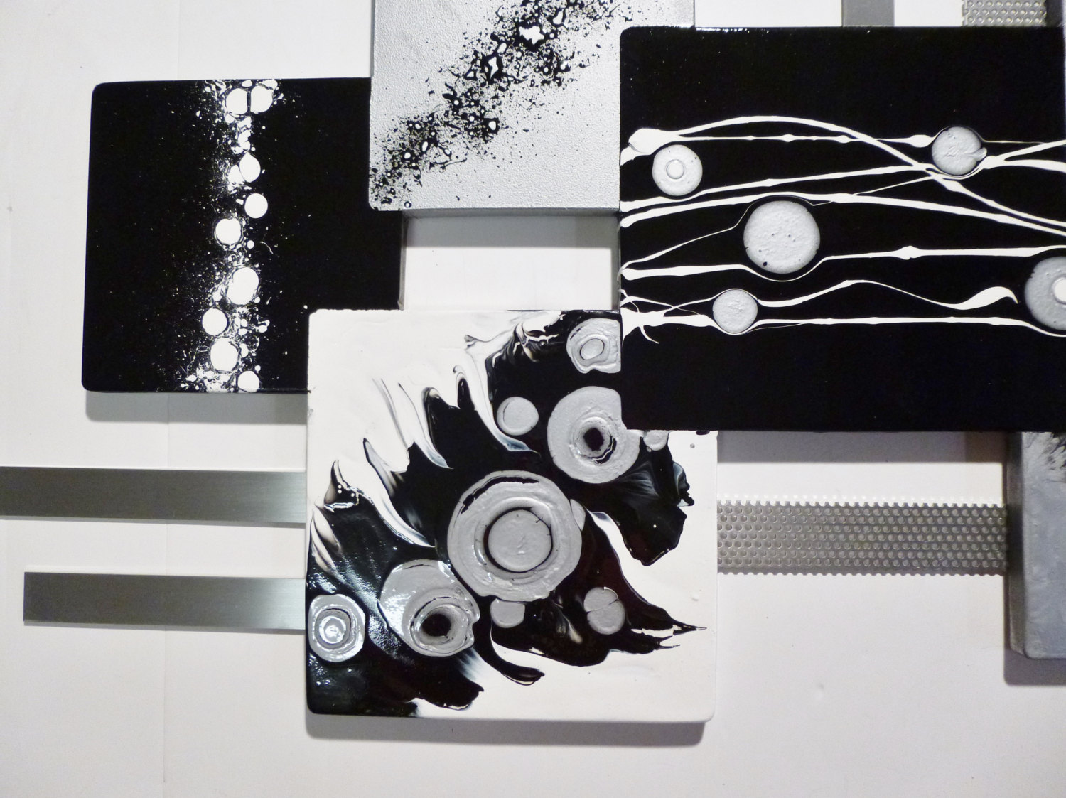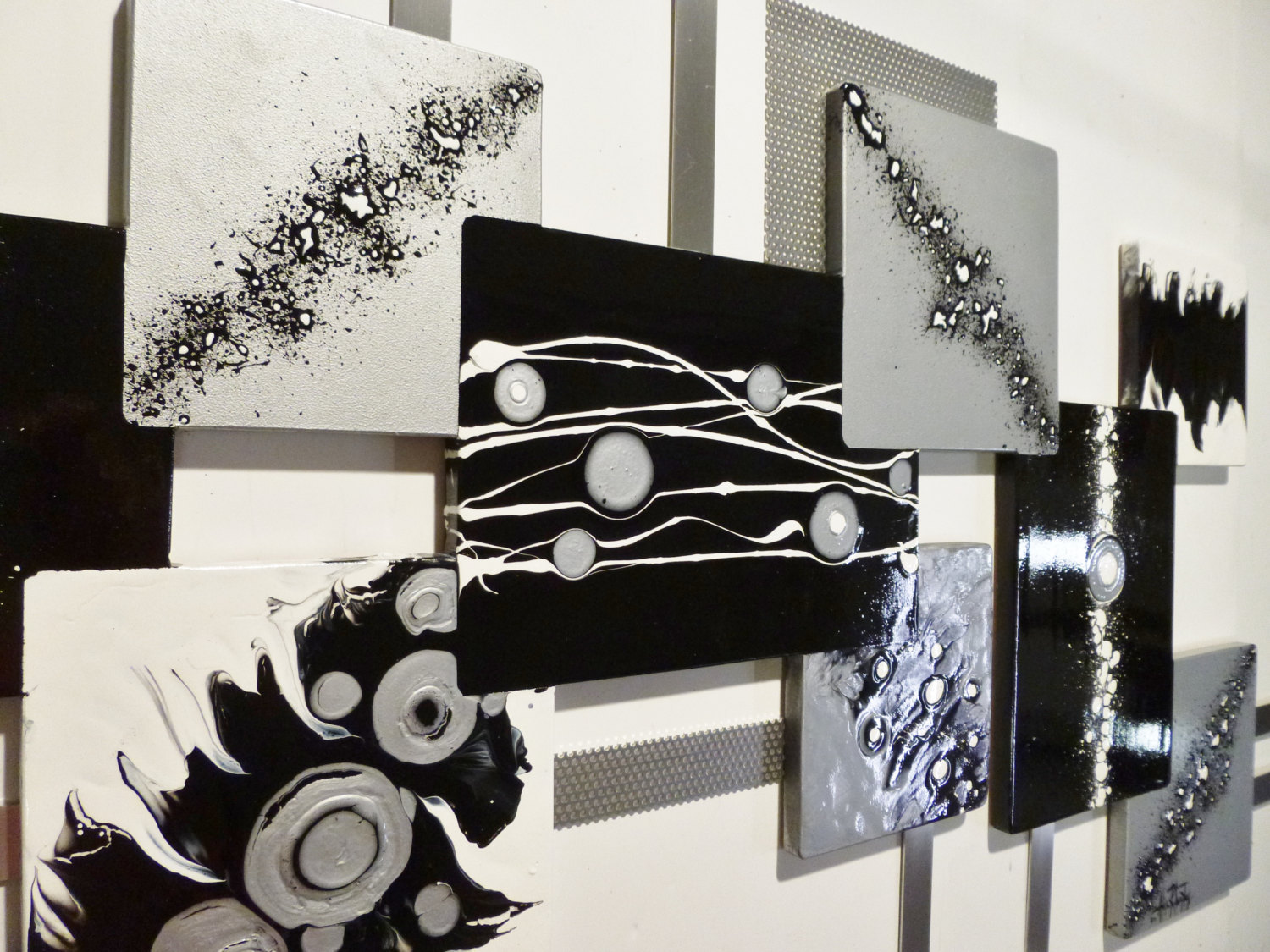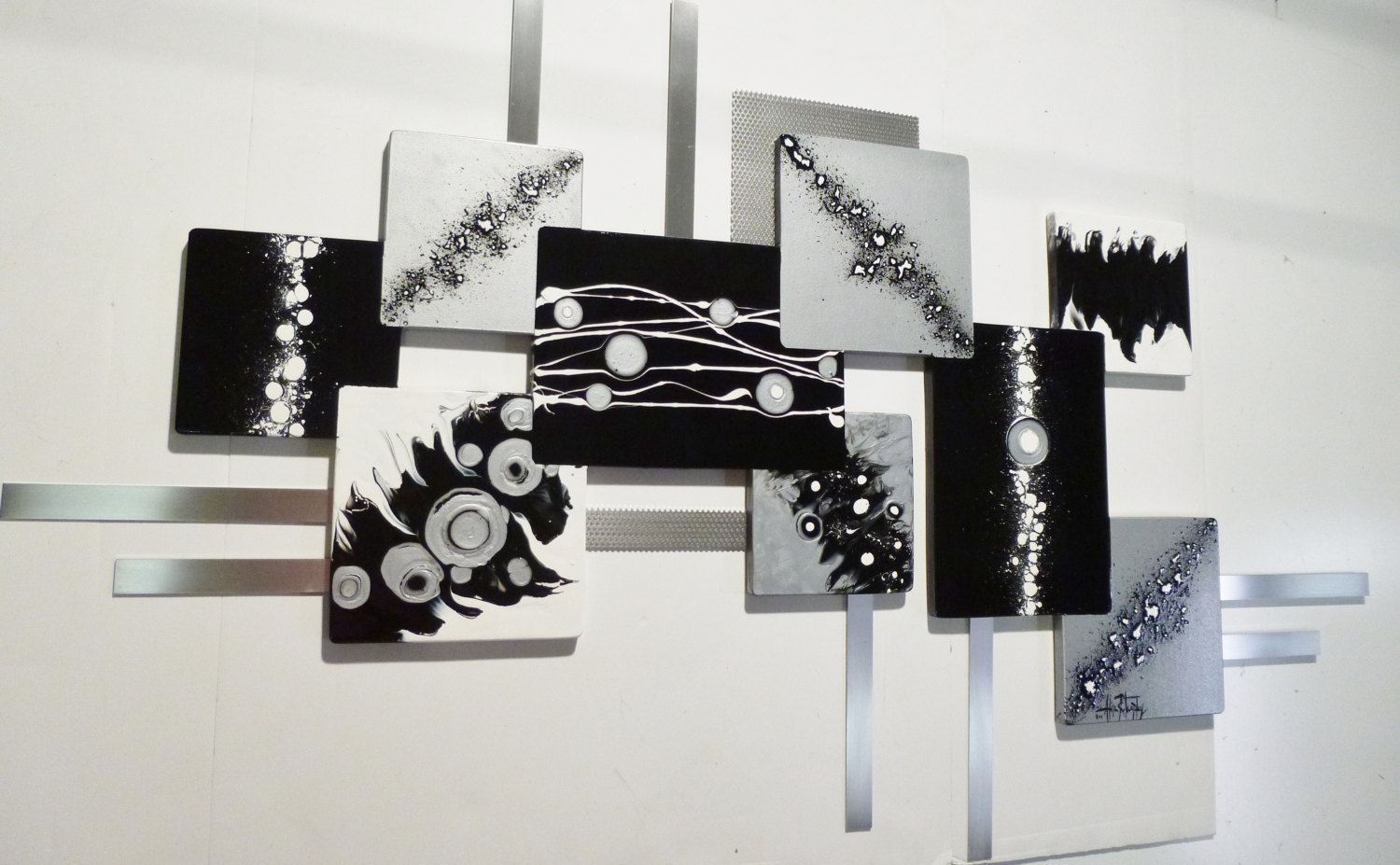 Stylish Geometric Abstract Art Black n White Wood Metal Wall Sculpture 36x24 wal
