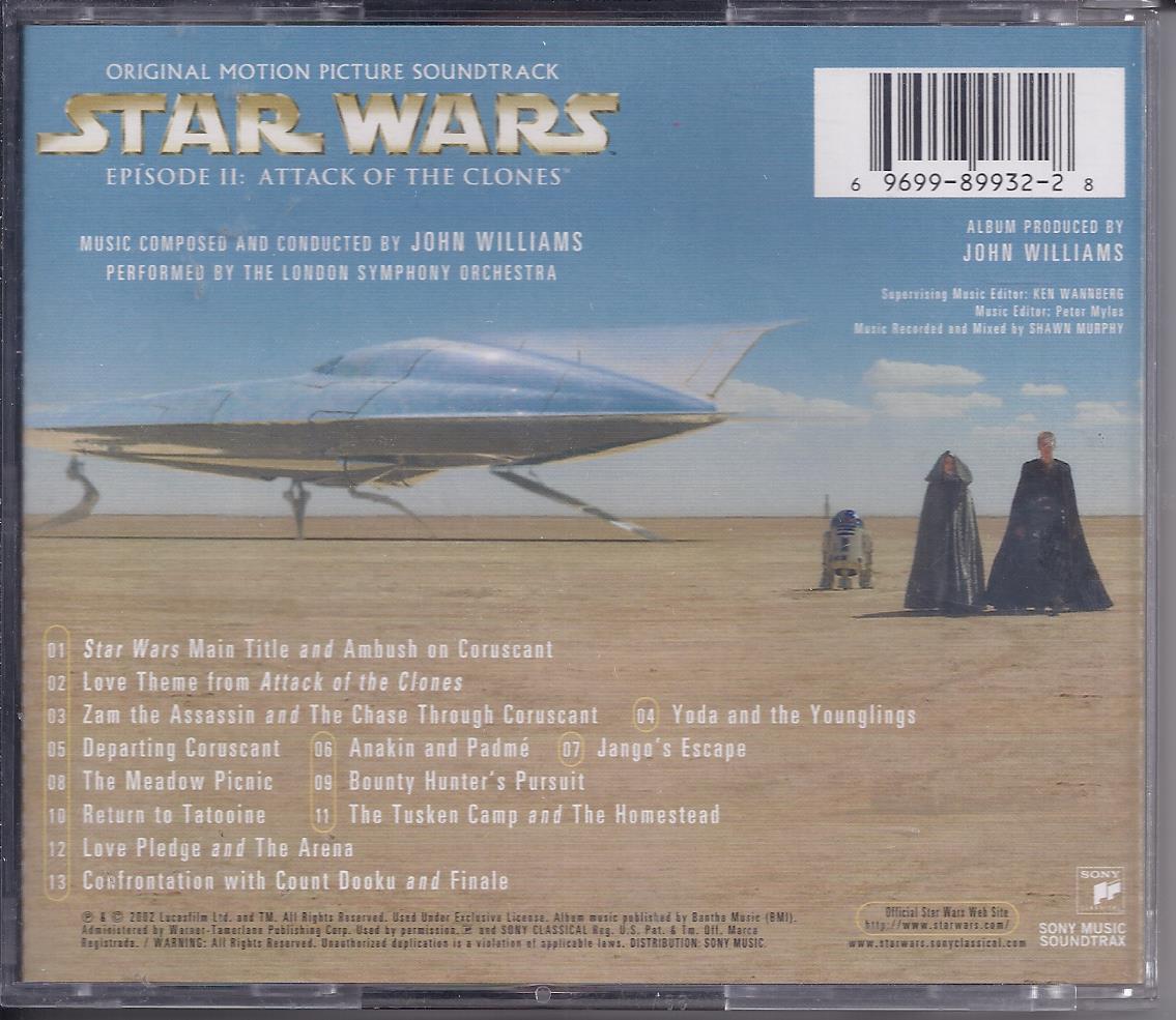STAR WARS Main Title and Ambush on Coruscant / Love Theme from Attack of the Clones / Zam the Assassin and the Chase Through Coruscant / Yoda and the Younglings / Departing Coruscant / Anakin and Padme / Jango's Escape / The Meadow Picnic / Bounty Hunter's Pursuit/ Return to Tatooine / The Tusken Camp AND The Homestead / Love Pledge AND The Arena / Confrontation with Count Dooku AND Finale.