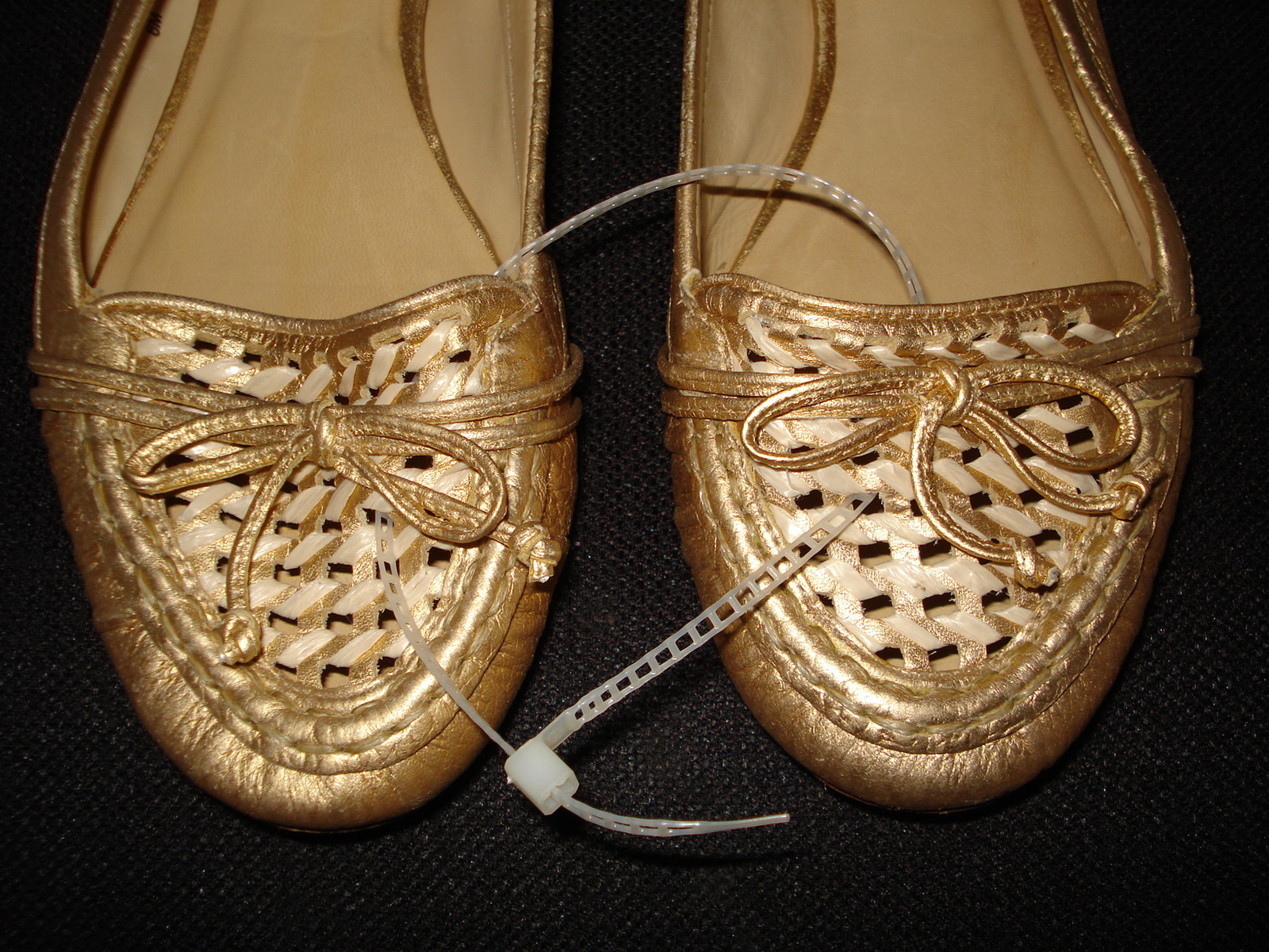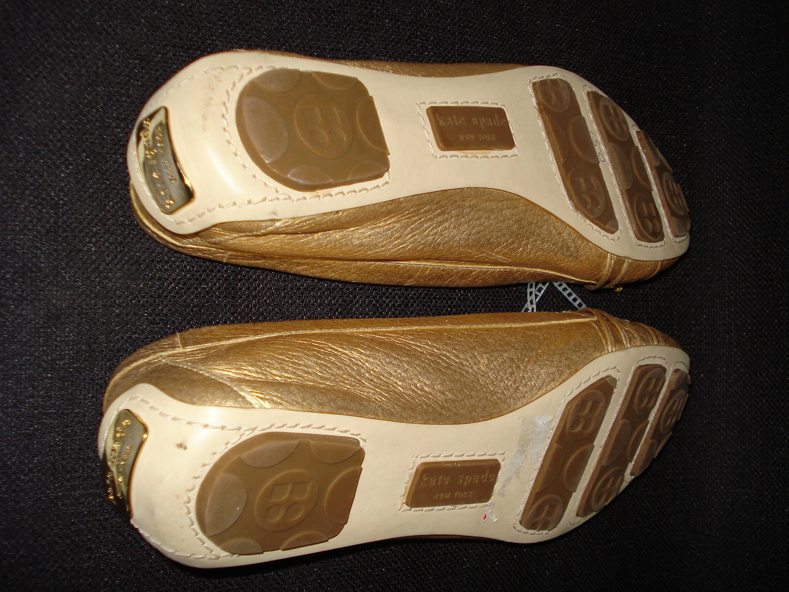 This is a fantastic pair of Kate Spade NY gold leather driving flat shoes in very good unworn condition. They are size 8 medium. The moccasins have a woven front toe portion with a bow. The back of the left heel has a smudge of something but the insides are clean and the soles are free of marks. The loafers measure approximately 10" from heel to toe.