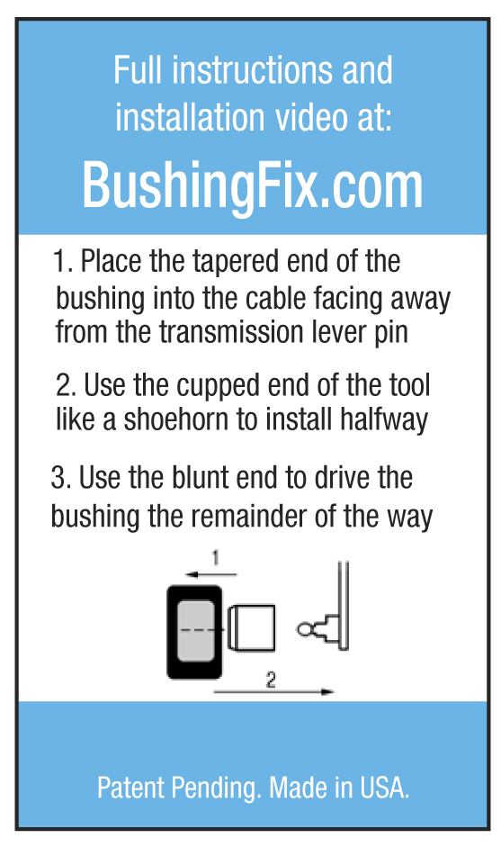 The Ford F-350 shift cable repair kit allows you to quickly and easily repair your shift cable by replacing the bushing. This is a complete shift cable repair kit engineered to provide a safe and effective means to replace the transmission bushing. Item includes not only a replacement bushing but the installation tool as well. The patent pending coupling and custom molded replacement bushing ensure a quality repair with ease. A professional can perform this repair in under 5 minutes, average time for a non-professional is less than 10 minutes.