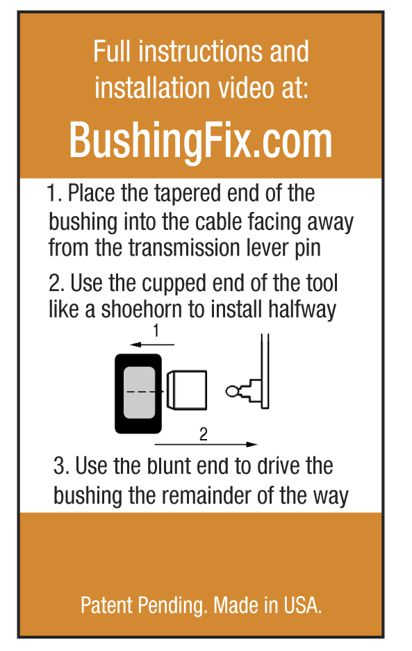 The shift cable repair kit allows you to quickly and easily repair your shift cable by replacing the bushing. This is a complete shift cable repair kit engineered to provide a safe and effective means to replace the transmission bushing. Item includes not only a replacement bushing but the installation tool as well. The patent pending tool and custom molded replacement bushing ensure a quality repair with ease. A professional can perform this repair in under 10 minutes, average time for a non-professional is less than 25 minutes.