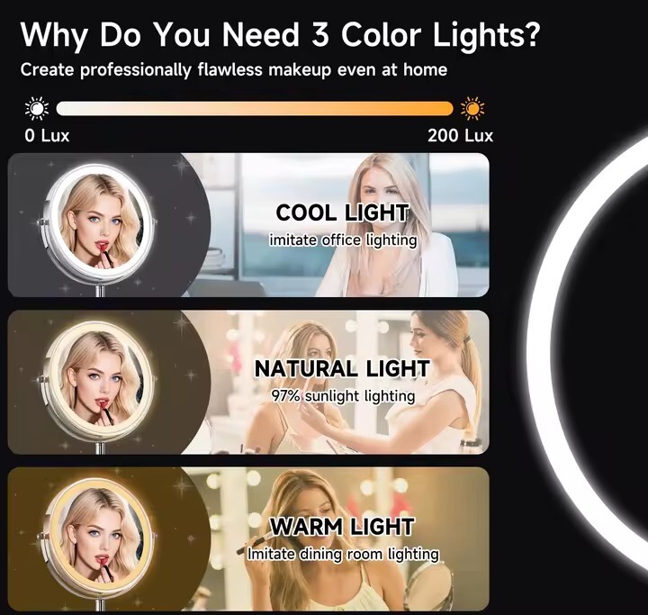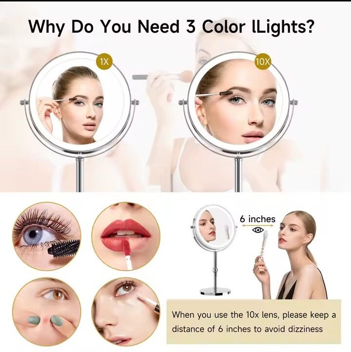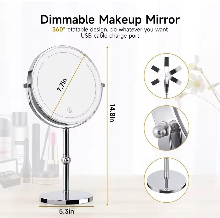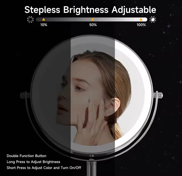 Adjustable Magnification and Brightness Lighted Makeup Mirror Stand Rotates 360