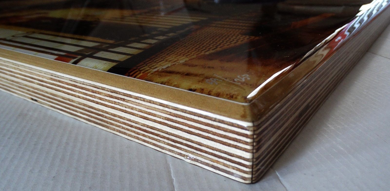 The art work is dry mounted on a high quality 1/8" tempered masonite board. The bond is everlasting and will never lift or peel. The art work is covered with a liquid acrylic that protects the art from ultra violet rays and moisture. The printed art is mounted on a laminated Russian birch frame. The final result is a high quality liquid acryclic art that will greatly enhance your home decor.