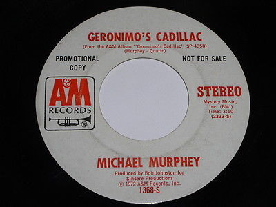 This is a vintage promotional 45 rpm phonograph record by Michael Murphey. Title: "Geronimo's Cadillac". This is the mono/stereo issue. Record label: A M 1368.