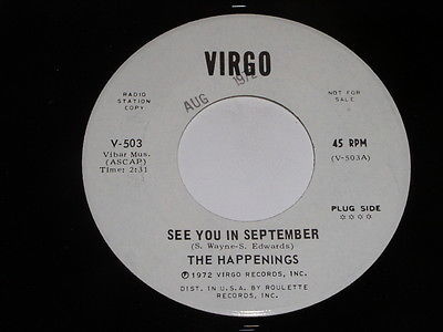 This is a vintage promotional 45 rpm phonograph record by The Happenings. Title: "See You In September". Flipside: "Why Do Fools Fall In Love". Record label: Virgo V-503.