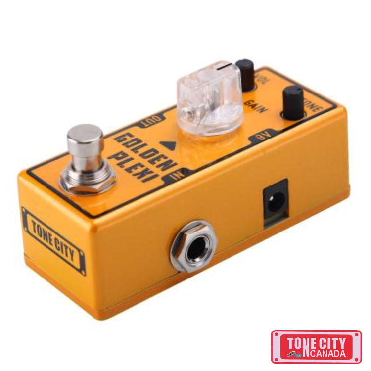 $85.00Limited tine only $64.00 As introduction to Tone CityTone City TC-T7Tone City Golden Plexi Drive Pedal (Carl Martin Plexi Style) Pedal.This is the Golden Plexi by Tone City. If you're looking for a Marshallstyle tone in an affordable and toneful box check out the Golden Plexi. Transform your Fender (or any clean channel) into a British sounding beastwith all the best types of overdrive you could ask for. If you're a fanof the Carl Martin Plexi Tone you're going to love this pedal. There arethree pots that control the Gain,Volume,Tone.Gain –Controls the overdrive tone.Volume –Controls how loud you want to be.Tone –Controls the treble presence of the pedal. All ToneCity pedals are True Bypass and require a regular 9v Power Supply for operationas there's no battery slot.Tone City Pedals are the creation of J.Wong designer,technician,creator of many pedals in China we will not mention here, many of them you probably own or heard of, mostly everyone has enjoyed his musical creations.He is now on his own and these are his NEW creations fully hand made and with no restrictions to his genius.Limited time special prices as introductory to Tone City Effects.MEC is a Canadian distributor of Tone City.What we have found:These pedals are heavy they weigh 3 times as much as a mooer,eno,xvive etc.Right of the start you can sense the quality. As we plug in and play these analog little marvels we are blown away in how they sound. Quantities are limited as these are NOT mass produced so stock on these will vary and although it might show sold out don't worry soon there will be a few more.