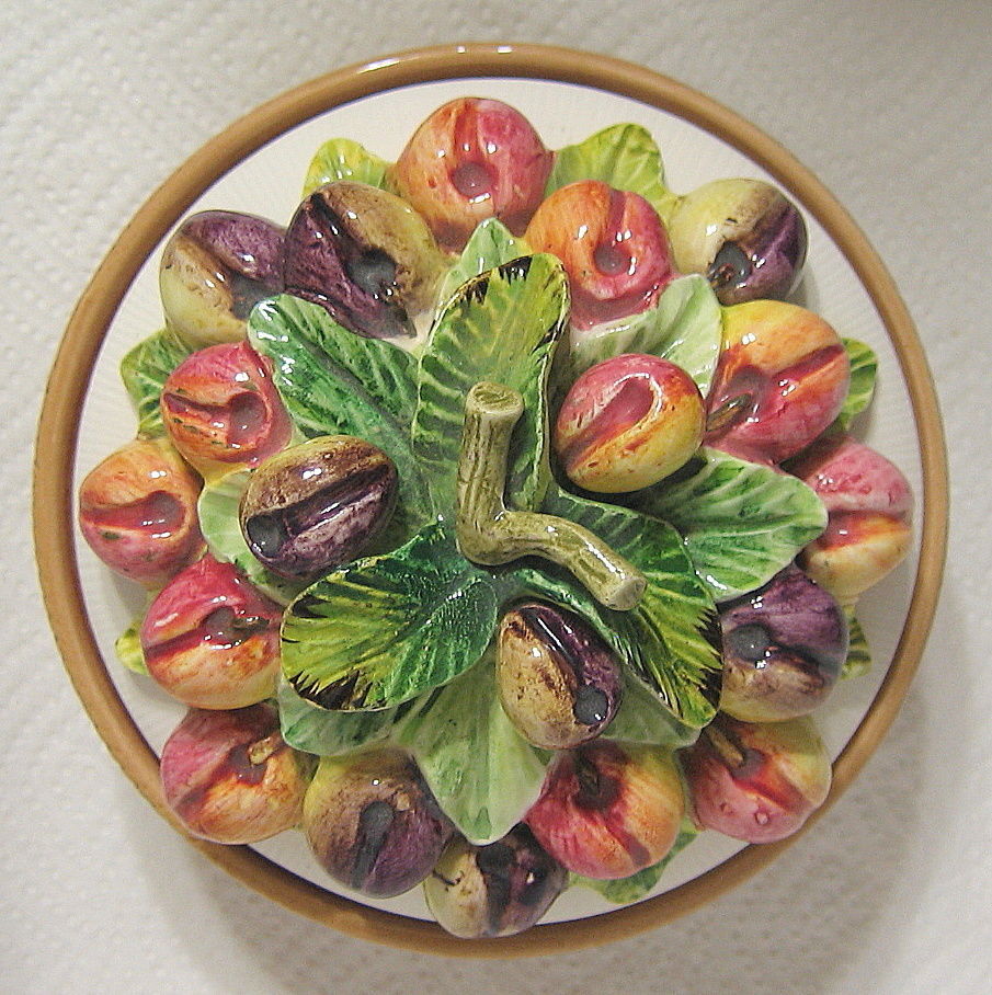 This is a delightful Small Ceramic Trinket Box made in Japan. Even though the original label is missing, we researched the number M4073N and found this to be made by Arnart. There is a sweet basket weave bottom with a colorful fruit top. Fruit represented look to be various colors of plums or peaches. Leaves and stems are represented as well. This would be best used as a container for small non-food items or a curio collectible.
