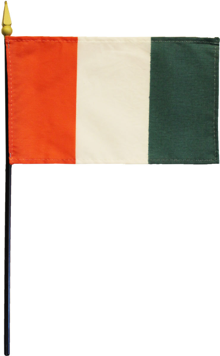 Our 4" x 6" Ivory Coast stick flags are made from a high quality, silk-like polyester fabric. They feature a hemmed flag mounted on a black plastic 10 inch staff with a gilded spear point. These versatile stick flags can be used on tabletops and desks, to wave in parades, or to decorate flower arrangements. Bases for the stick flags are sold separately and are available in our Accessories section.