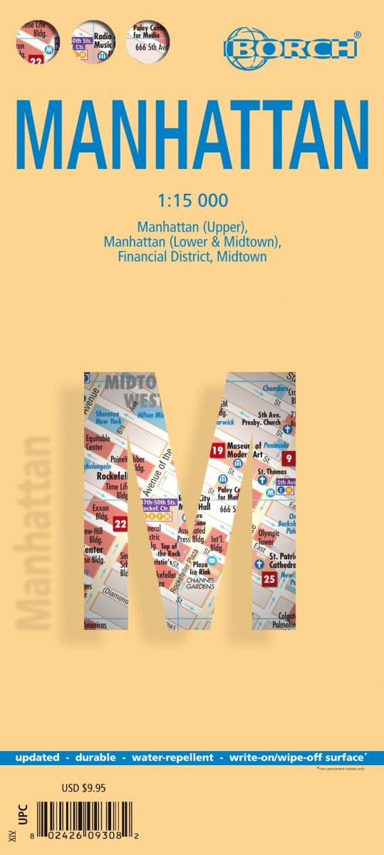 Our folded street and travel map of Manhattanincludes sights, museums, theatres, monuments, religious sites, shopping malls, parking,restaurants, gas stations, camping sites, hotels, and markets. The colored map includes insetsof theFinancial District, Midtown,theNew York City Public Transport System and theTop 30 Sights.Climate charts show the average daily temperatures, humidity, hours of sunshine and precipitation for each month.These Borch mapsare durable, water-repellent and feature a laminated write-on/wipe off surface and measureapproximately 9.5"x4.5" when folded up and unfolds into a flat double-sided map measuring 34"x19.25".
