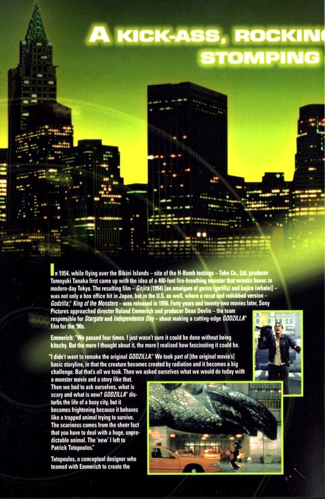 Following the French atomic bomb tests in the South Pacific, an unknown creature is spotted passing eastward through the Panama Canal. Scientist Niko Tatopolous is called in to investigate the matter, and he quickly arrives at the conclusion that a giant, irradiated lizard has been created by the explosions. Godzilla then makes its way north, landing at Manhattan to begin wreaking havoc in the big city. Even with the combined forces of the U.S. military to fight the monster, will it be enough to save the people of New York?