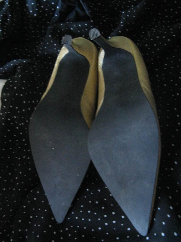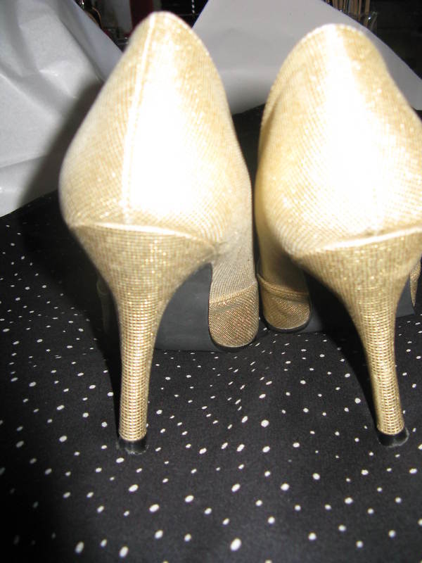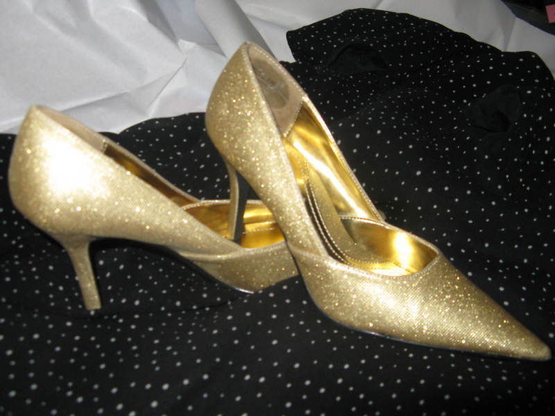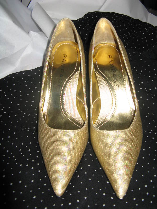 Nearly new without box, beautiful sparkley gold, classic stiletto pumps in a size 6 UK3.5 36 with a 3 1/2 stiletto heel.These were used for about 20 minutes in a photo shoot, so the only wear they show are a couple of tiny scuffs. So flashy, the photo just doesn't do these party shoes by Rampage. These look just like a vintage pair I have from the 50s.Awesome! I love to shop and I'm closet cleaning the stuff I didn't wear so I have room for new. I will be listing designer fashions all month.Please ask all questions before bidding as all sales are final. I will combine shipping for multiple purchases. Please contact me for international, Alaska, and Hawaii shipping. Yee Haw! Remember that I am on the West coast of the US so shipping to the East coast and foreign countries can take a week longer. I try to ship out the first business day after you pay and I always provide you tracking info at that time so you may see where your purchase is. I can not be responsible for the the length of time it takes to reach you once it leaves my hands. Thanks for understanding.