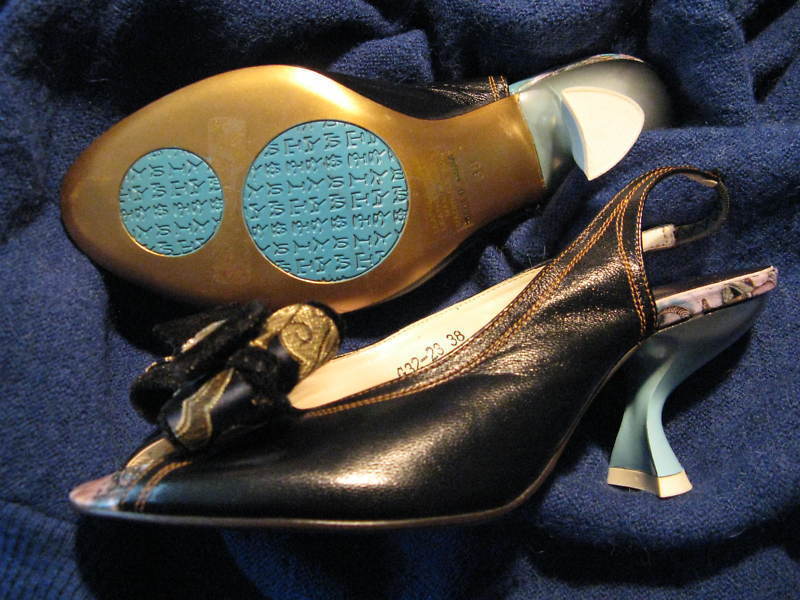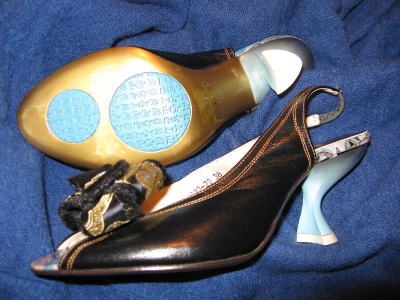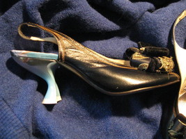New without the box, beautiful Juno New York sling backs much like Irregular Choice. Amazing baby blue and silver air brushed sexy curved Louis heel, butter soft black leather uppers with asian brocade and velvet bow, large and tiny rhinestones.Anime and metallic lining! Wew!! Alot going on in these crazy, yet stylish shoes. Marked size 38 which in this case works best for a 6 1/2 to 7 UK 4-4.5 Insole measures 9 9/10" and width is 3 1/4" with a 3" heel.Bought for a fashion show, lugged around and never worn. Small scratch on the botton by the heel. Can't see when being worn.Super cute and unusual design! Perfect for parties and car shows! I love to shop and I'm closet cleaning the stuff I didn't wear so I have room for new. I will be listing designer fashions all month.Please ask all questions before bidding as all sales are final. I will combine shipping for multiple purchases. Please contact me for international, Alaska, and Hawaii shipping. Yee Haw! Remember that I am on the West coast of the US so shipping to the East coast and foreign countries can take a week longer. I try to ship out the first business day after you pay and I always provide you tracking info at that time so you may see where your purchase is. I can not be responsible for the the length of time it takes to reach you once it leaves my hands. Thanks for understanding.