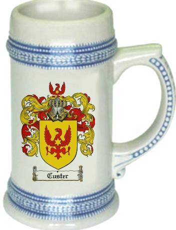 Custer Family Crest Stein / Coat of Arms Beer Tankard. We believe our Coat of Arms Steins are of the highest quality anywhere. The glassware quality is very thick and sturdy. The stein feels great in your hand with a very thick handle. Fill this glass with your favorite beer or beverage. keywords: steins, beer, german, glass, glassware, cup, tankard, goblet, family shields, shield, family, genealogy, heraldry, code of arms