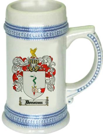 Donovan Family Crest Stein / Coat of Arms Beer Tankard. We believe our Coat of Arms Steins are of the highest quality anywhere. The glassware quality is very thick and sturdy. The stein feels great in your hand with a very thick handle. Fill this glass with your favorite beer or beverage. keywords: steins, beer, german, glass, glassware, cup, tankard, goblet, family shields, shield, family, genealogy, heraldry, code of arms