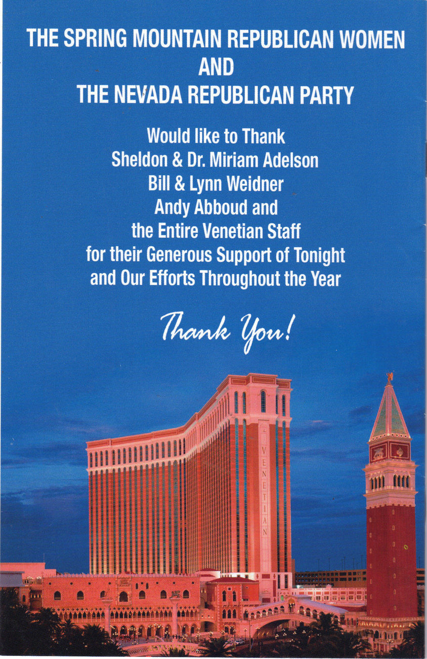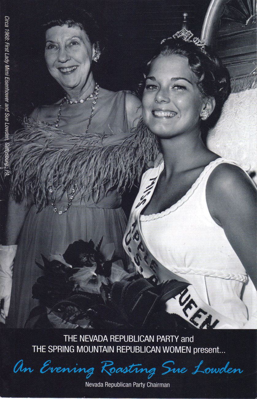 This is the official Event Program by The Nevada Republican Party and The Spring Mountain Republican Women presenting " An EVENING ROASTING SUE LOWDEN", Nevada Republican Party Chairman.