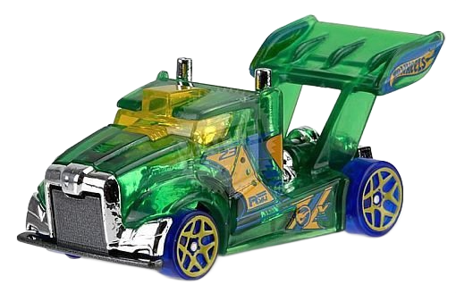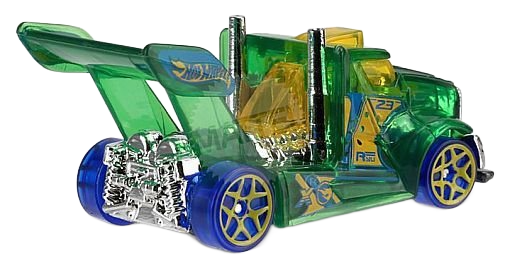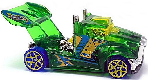 Description: Translucent Green, w/Chrome interior, Yellow windows, '23' w/racing graphics on sides, TH Circle Flame logo on lower sides, Yellow Blue 'Hot Wheels' logo rear fin, Gray Malaysia Base w/YellowYS's. 120515-042719P-D07