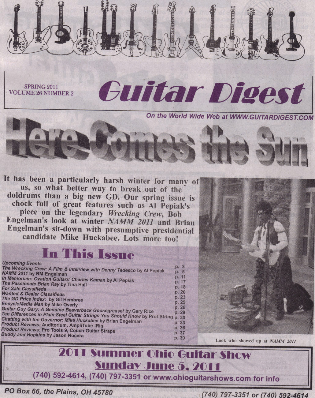 This is the Spring 2011 Volunme 26 Number 2 issue of GUITAR DIGEST, 39 pages and features: AL PEPIAK's piece on the legendary WRECKING CREW, Bob Engelman's look at winter NAMM 2011 and Engelman's sitdown with presumptive presidential candidate MIKE HUCKABEE and lots more!