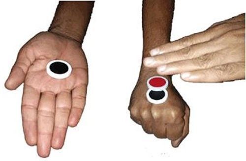 One of two chips apparently melts and penetrates into the performer’s clenched fist.